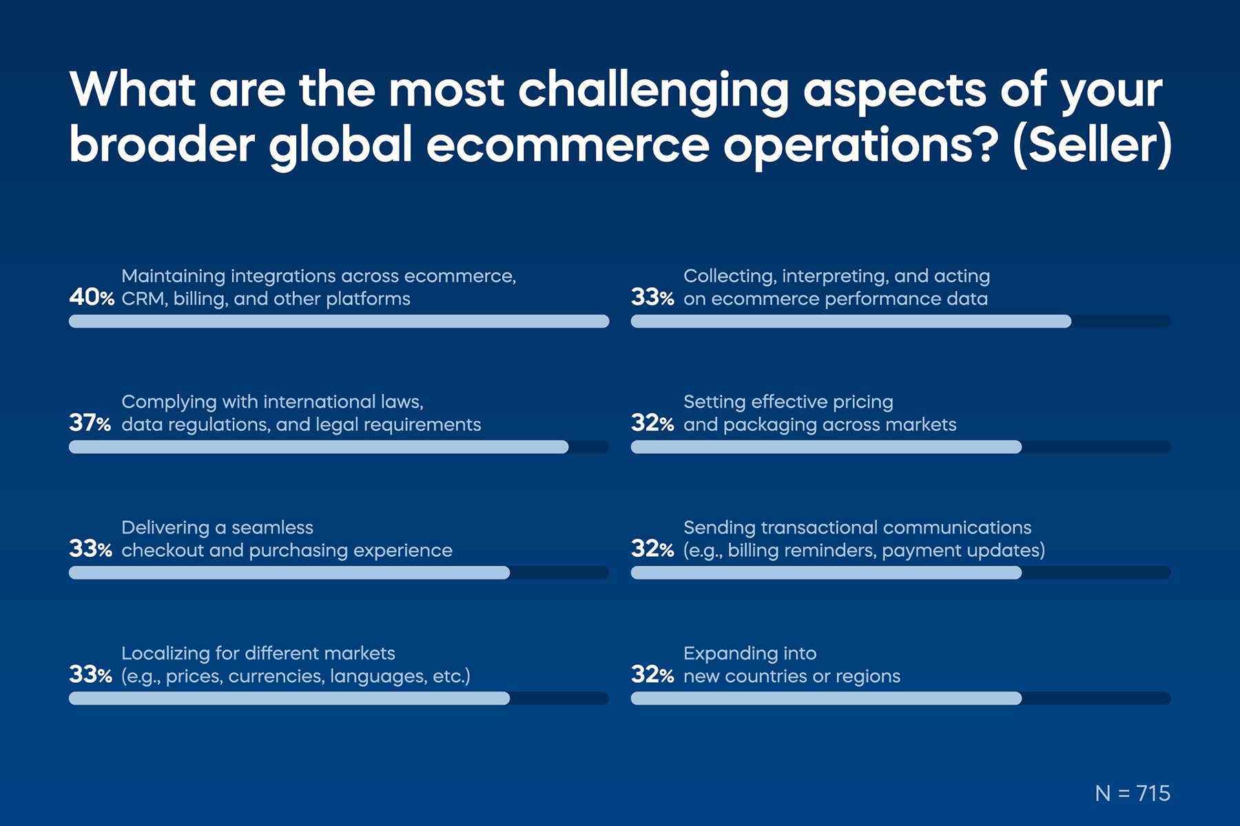 Sellers face steep hurdles when scaling globally, with integrations, compliance, and localized checkout ranking as top barriers.