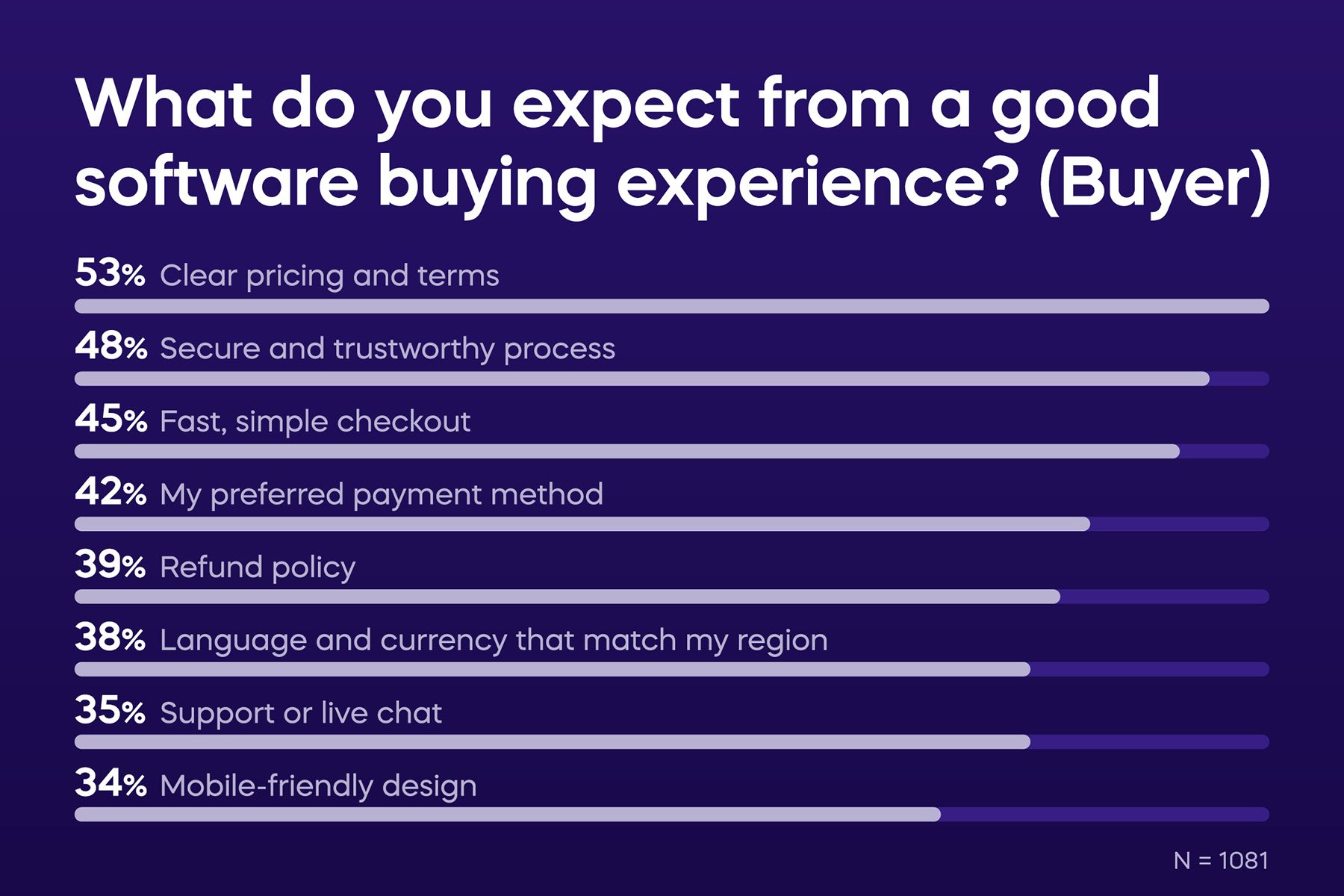 Buyers rank clear pricing and terms as the most important factor in a positive checkout experience. Sellers, however, prioritize speed and security — while underestimating the importance of transparency and trust.
